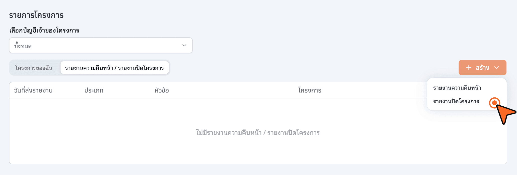 กดปุ่มสร้าง เลือกรายงานปิดโครงการ