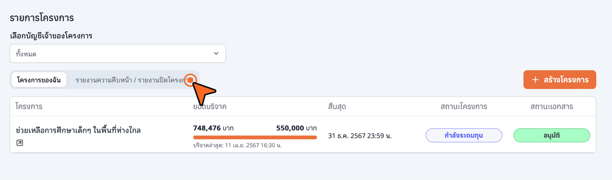 เมื่อเข้าสู่หน้า โครงการของฉัน จะเจอรายการโครงการ เลือกแถบ