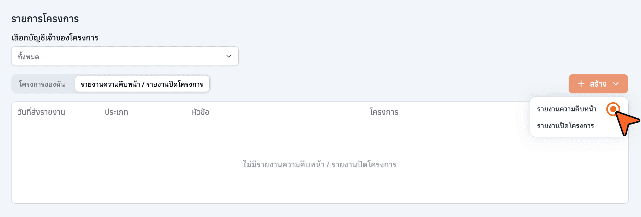 เมื่อเข้าสู่หน้า โครงการของฉัน กดแถบ รายงานความคืบหน้า / รายงานปิดโครงการ