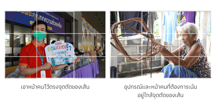 กฎสามส่วน และ จุดตัดเก้าช่อง ให้คุณวางองค์ประกอบที่สำคัญที่สุดไว้บริเวณจุดตัด เช่น หน้าคน (ถ้าสนใจอยากเรียนรู้รายละเอียดเพิ่มเติม คลิก